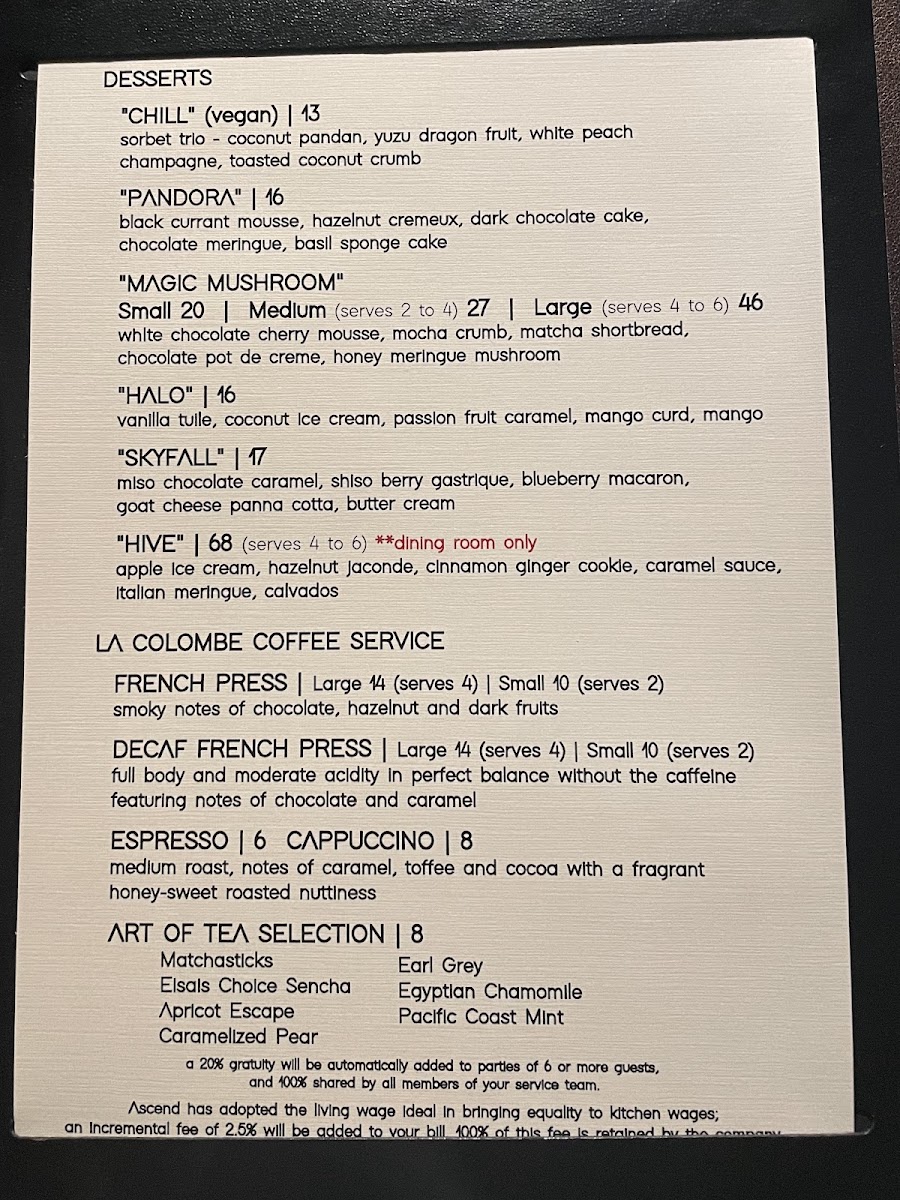 white chocolate cherry mousse, mocha crumb, matcha shortbread, chocolate pot de creme, honey meringue mushroom